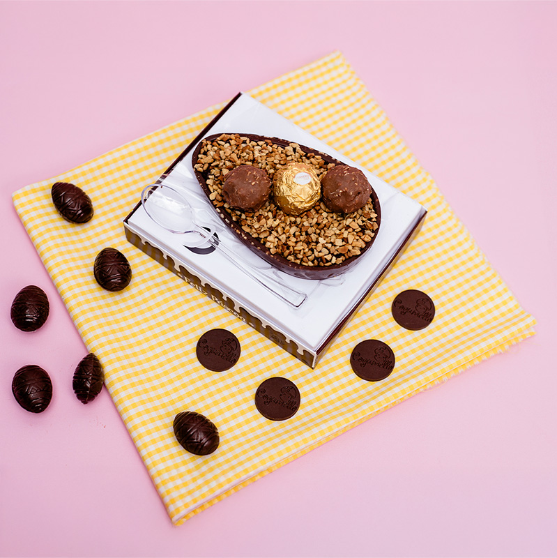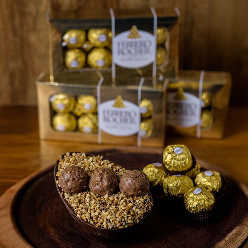 Um dos queridinhos por aqui. Ovo com casca em chocolate meio amargo, camadas de brigadeiro ferrero, Nutella pura, decorado com bombom ferrero rochere e castanha de caju.