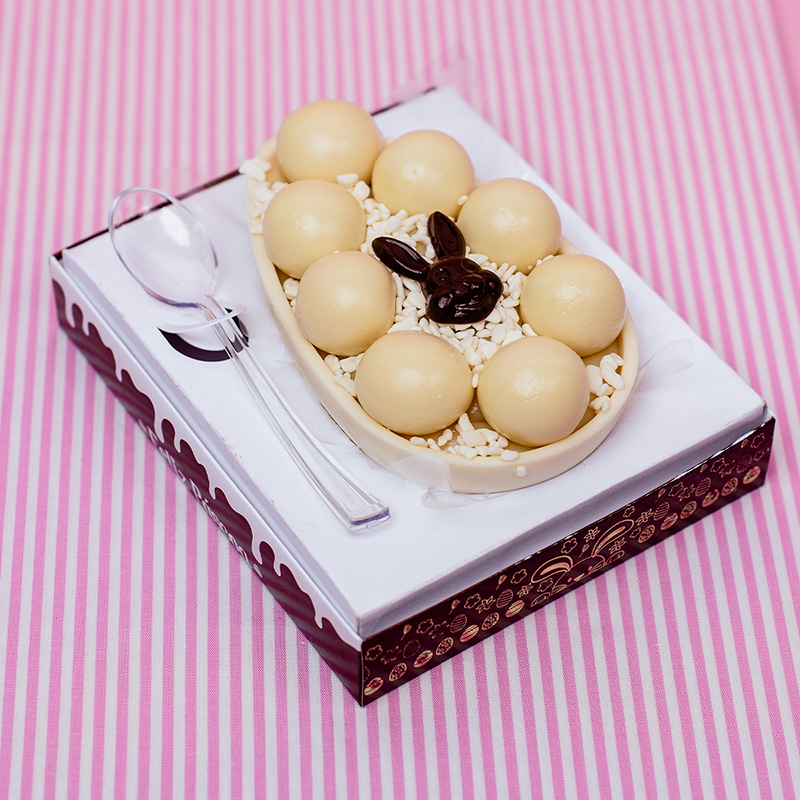 Desenvolvido para despertar as memórias de infância. Casca de chocolate branco ou meio amargo, até a borda de brigadeiro de leite ninho, finalizado com confeito belga branco e docinho de leite ninho.